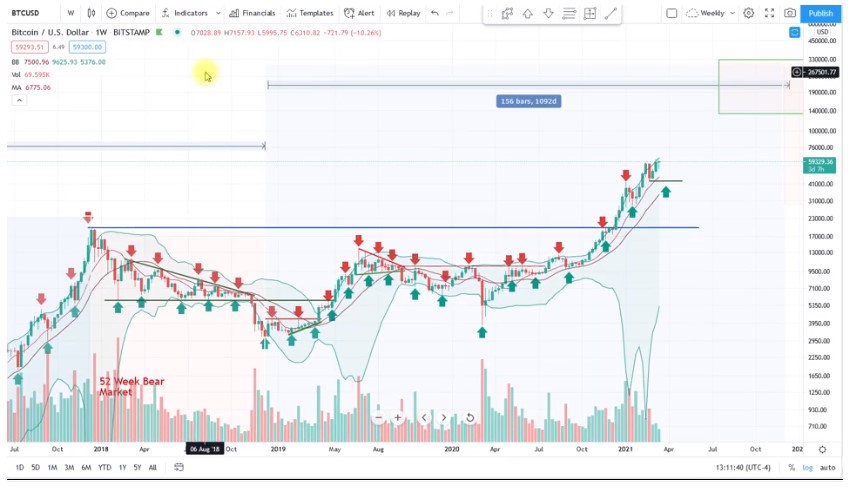 We’re in day-55 of the cycle with no significant decline. Expect to see more consolidation into a day-65 cycle low which could serve as a base for a big move. I don’t see the bears sinking the price below that cycle low, as the bulls are ready to propel the price to a retest of -$61,825 pretty soon.