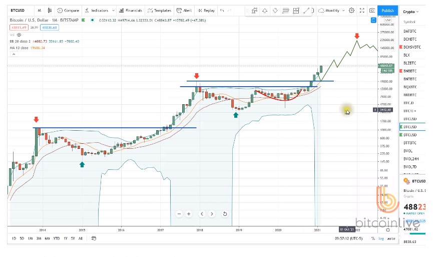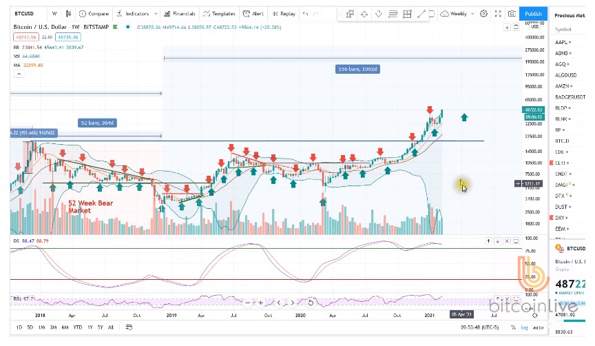 Fig.3. Bitcoin: 5 green candles in a row, exceeding the monthly BB by 3 candles. Source: bitcoin.live