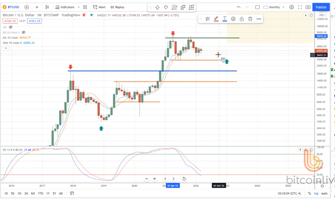 BTC monthly chart shows the price action sitting below the 10-month MA, with a double top. The last time the 4-year cycle peaked was April last year and the entire structure looking bearish in the last six months.